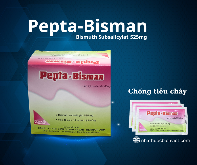 Pepta-Bisman - Là một sản phẩm với thành phần hoạt chất chính là Bismuth subsalicylat để điều trị những khó chịu tạm thời ở dạ dày và đường tiêu hóa, chẳng hạn như buồn nôn, ợ nóng, khó tiêu, khó chịu ở dạ dày và đau bụng, bệnh tiêu chảy.